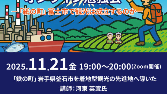 「紙の町」富士市ですが、富士山の恵みや地域資源を活かした「着地型観光」の可能性は無限大です。かつて「鉄の町」として知られていた岩手県釜石市を、地域観光の先進地に再生された第一人者を講師にお招きし、オンライン勉強会を開催します。■ オンライン...